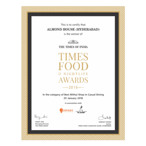 Awarded Best Mithai Shop in Casual Dining by Times Food & Nightlife Awards, 2018