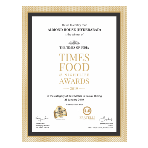 Awarded Best Mithai Shop in Casual Dining by Times Food & Nightlife Awards, 2019