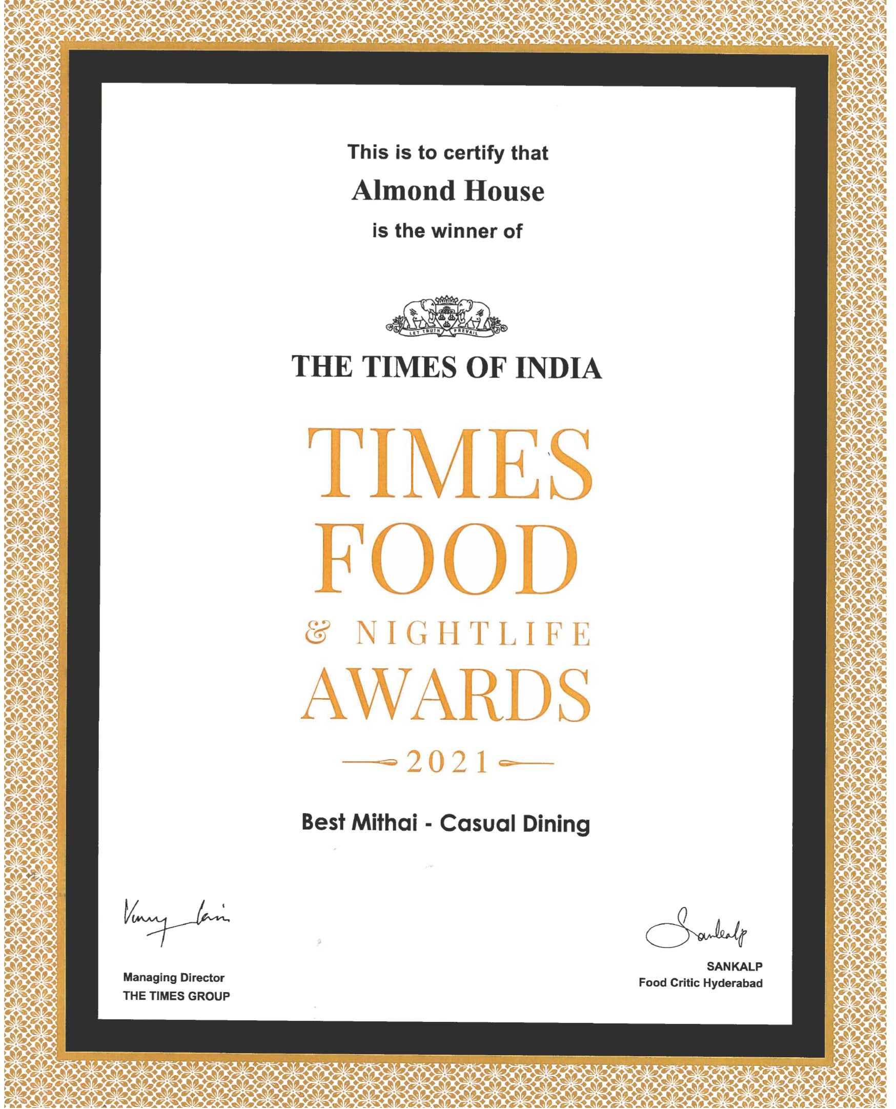 Awarded Best Mithai Shop in Casual Dining by Times Food & Nightlife Awards, 2021