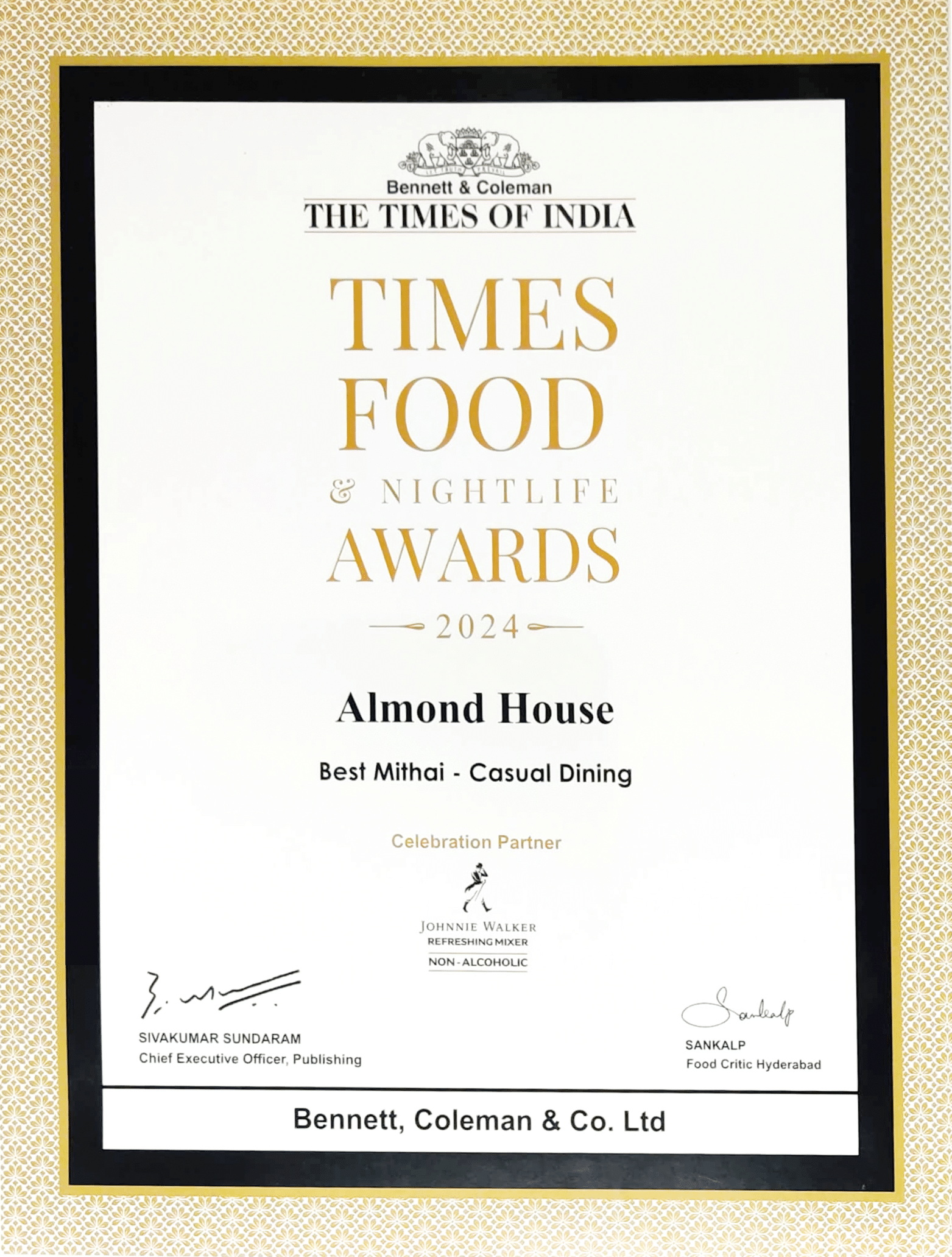 Awarded Best Mithai Shop in Casual Dining by Times Food & Nightlife Awards, 2024